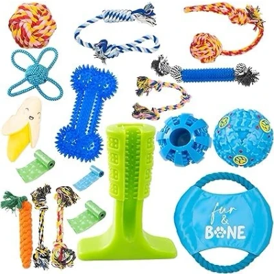 Fur & Bone 18 Pack Dog Chew Toys Puppy for Boredom Indestructible with Rope Toys, Squeaky Toy Toy, Teething Small Medium Dogs