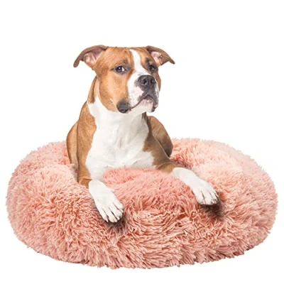 Fur & Bone Round Plush Donut Dog Bed, Bed Cat Fluffy Self Warming Beds Washable with Non Slip Waterproof Bottom Calming (60cm, Pink)