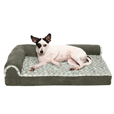 FurHaven Medium Memory Foam Dog Bed Two Tone Faux Fur & Suede L Shaped Chaise w/Removable Washable Cover Dark Sage,