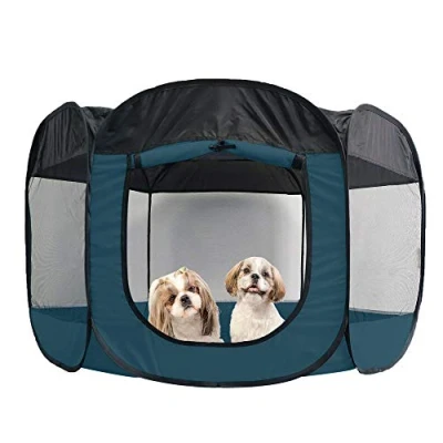 DESIGNED FOR PETS: The playpen tent promotes comfort and security, providing dogs and cats a safe enclosed space for lounge and play; the 360-degree light mesh window view and ceiling delivers great airflow, as well visibility for anxious pets and owners PERFECT FOR TRAVEL: The playpen's pop-up design ensures that it can be set up, and put away, within seconds; the tent also comes with small metal stakes used to secure it to the ground, making it an ideal outdoor accessory for camping and picnics OPEN WITH CARE: Please exercise caution and care when unfolding the tent to avoid startling yourself as well as those around you RECOMMENDATIONS: NEVER leave pet unattended while in use; if secure stakes are not used with the product, interior weights are suggested to help prevent shifting by larger or more active animals PRODUCT DETAILS: Sailor Blue; Extra Large, 51" x 44" x 29.5" AVAILABLE VARIANTS: The playpen comes in Hunter Green, Sailor Blue, and Gray; it's also available in Small, Medium, Large, and Extra Large