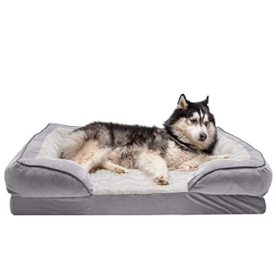 DESIGNED FOR PETS: The classic bolstered sofa design promotes ultimate comfort and security, providing high-loft orthopedic cushion support as well as a super cozy nestling and burrowing space for dogs and cats SLEEP SURFACE: The interior sleep surface is lined with cuddly soft, plush 'wave' faux fur, while the exterior is wrapped in smooth velvet fabric; both materials are gentle on noses and paws for enhanced snuggling and burrowing comfort EASY ON JOINTS: The memory foam top helps cushion pressure points, relieve joint pain, and improve body alignment, while the fluff-filled bolster railings support the neck, back, hips, and joints; both help to ease discomfort and encourage restful sleep PRODUCT DETAILS: Granite Gray; Jumbo, 40" x 32" x 9.5" (4" Foam; Sleep Surface: Approx. 34.5" x 26.5" with 16" opening) AVAILABLE VARIANTS: The bed comes in Brownstone, Granite Gray, and Celadon Green; it's also available in Small, Medium, Large, Jumbo, and Jumbo Plus EASY CARE: The removable dog bed cover is completely machine washable for your convenience; for more specific washing instructions, please refer to the hang tag and/or seam label (if applicable) NOT SUITABLE for pets with excessive teething or destructive chewing behavior