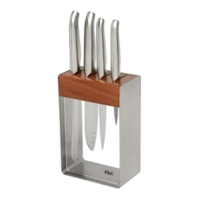 Elegant design: Knife block made from quality stainless steel and teak with acrylic viewing panel to aid knife selection featuring 4 universal knife slots to organise your knives the way you like First-class manufacturing: Knives with unrelenting sharp tech edge blades, hand-sharpened to a 26° cutting angle and hardened to 55-57 HRC for easy chopping and slicing of meat, fruit and vegetables Materials: Knives with precision-crafted X50CrMoV15 Japanese stainless steel blade for excellent edge and sharpness retention and optimal rust resistance for greater product longevity Secure handling: The ergonomic reverse-wedge, anti-fatigue handle of the knife locks into the hand and ensures a safe grip by fully protecting the fingers while allowing full use of the blade 1 x Stainless steel and teak knife block, including East/West Santoku Knife 17cm, Bread Knife 20cm, Utility Knife 15cm, Paring Knife 9cm, item No. 41346, Weight: 5.4233716452 Pounds, Manufacturer: FURI