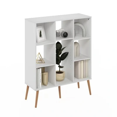 Mid-century modern design with stylish wooden legs adds timeless elegance, effortlessly complementing various interiors from living areas to offices. 8 spacious cubes, perfect for organizing books, decorative items, baskets, and everyday essentials neatly and accessibly. Adjustable shelves to accommodate items of varying heights Made from durable, CARB-compliant composite wood, certified by PEFC for sustainability. Product Dimensions: 27.79 (D) x 80.01 (W) x 99.95 (H) cm.