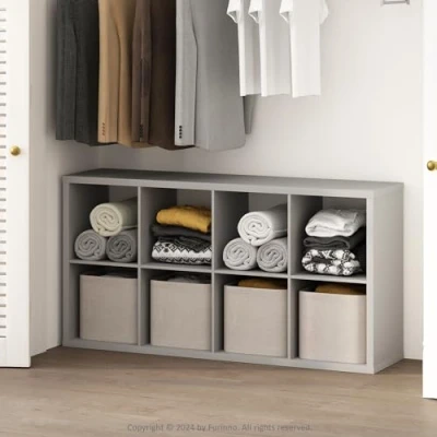 Furinno CUBIC Wardrobe Storage Organiser, 8 Cube Open Shelves Clothes Storage, 30mm Extra Thick Frame Closet for Bedroom, Closet, Light Grey