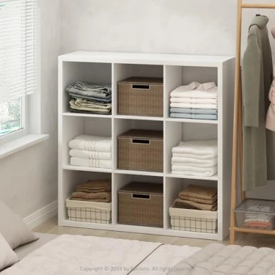 MODERN MINIMALIST DESIGN: This cube closet organizer features a clean open-shelf layout that streamlines closet organizers and storage for wardrobe closets, bedrooms, and living rooms, making the closet organizer practical and space-saving MULTIPLE CUBE ORGANIZER: This storage rack features extra-large cubbies (~13.6H x 13.5W) fit folded clothes, towels, handbags, toys, and most 13 fabric bins; works as shelves for closet, end-of-closet storage, or a small closet shoe organizer STURDY BUILD & WEIGHT CAPACITY: Durable engineered-wood construction for everyday use; weight limits (evenly distributed): 30 lb/13.6 kg on each shelf. The 30mm thick boards for the outer frame, making this shelf look even more robust and elegant EASY ASSEMBLY & EXPANSION: Comes with step-by-step instructions and labeled parts for quick setup; pairs easily with additional closet organizers and storage units to build a modular closet system PRODUCT DIMENSION: 37.1 (D) x 111.3 (W) x 111.3 (H) cm