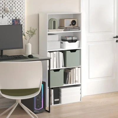 MODERN MINIMALIST DESIGN: This book shelf features a clean 5-tier silhouette in a slim 9.5 depth that blends into home offices, bedrooms, and living rooms, making the book shelf practical and space-saving ADJUSTABLE OPEN STORAGE: One adjustable shelf plus fixed tiers keep books, bins, and decor visible and within reach; overall 9.5 (D) x 23.6 (W) x 52.6 (H) inches so the bookshelf tucks beside desks, beds, or entry walls for tidy organization WEIGHT CAPACITY: Each shelf of this book shelf supports up to 15 lb (6.8 kg) when evenly distributed, 75 lb (34 kg) total for the bookshelf STURDY BUILD: Engineered-wood bookcase with a closed back adds rigidity; place the bookshelf against a wall and secure with an anti-tip kit for safe, family-friendly use PRODUCT DIMENSIONS: 24.1(D) x 59.9(W) x 133.6(H) cm