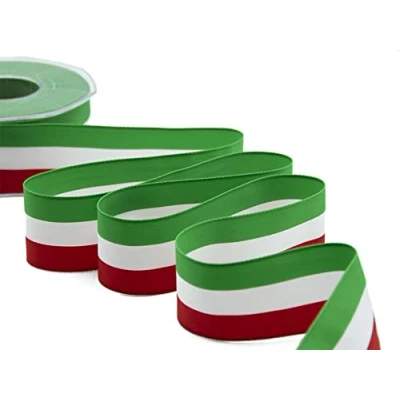 Red, white and green ribbon. They are carefully woven ribbons made with the lowest possible environmental impact Colour: Green Flag #32 The roll contains 25 meters of satin ribbon italian flag 40 mm All the Furlanis ribbons are designed and manufactured within the Cavaglià plant in Biella