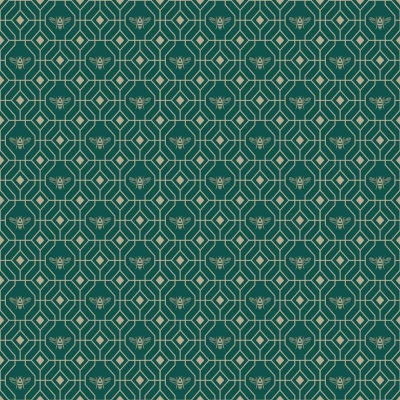 Bring a buzz to your interior with this bustling design. A traditional honeycomb geometric design is brought to life with a uniform pattern of busy bees in a glistening metallic finish. Seen here in the Emerald colourway.