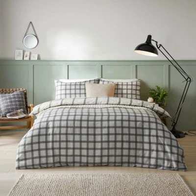 REVERSIBLE CHECK DESIGN: Features a classic square check pattern with small checks on one side and larger checks on the other for two timeless looks. MINIMALIST STYLE: Effortlessly blends with any bedroom decor, creating a calm and inviting atmosphere. SOFT AND DURABLE: Crafted from a polycotton blend for lasting comfort and easy everyday care. EASY CARE: Machine washable at 30°C, with low tumble drying and cool ironing to keep your bedding looking fresh. 1. PRACTICAL BUTTON CLOSURE: Keeps your duvet securely in place for a neat and comfortable sleep.