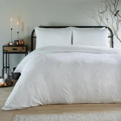 ULTRA SOFT TOUCH FABRIC: Sink into exceptional softness every night with a cosy texture perfect for chilly evenings. PLAYFUL TUFTED DESIGN: Featuring charming ghost motifs, this bedding adds a fun and whimsical touch to your space. VERSATILE STYLE: The plain reverse offers easy styling options to suit your mood or interior theme. EASY-CARE CONVENIENCE: Keep your bedding fresh and fabulous with simple machine washing, ideal for busy households. SEASONAL CHARM: Add a subtle Halloween-inspired twist to your bedroom décor with this beautifully cosy and stylish duvet set