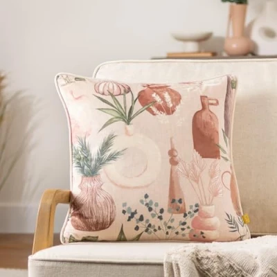 Featuring detailed printed ceramics and vases holding delicate sprigs and dry palms in natural, earthy clay tones. Complete with a plain velvet reverse, piped trim and hidden zip fastening. Made of 100% Polyester fabric, this cushion is super soft, yet durable. Designed, printed and made in the UK. Machine Washable (40 degrees max), Line Dry and Cool Iron Only.