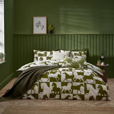 furn. Herve Reversible Duvet Cover Set Wild Horses Statement Bedding (Olive King U.K. Standard)