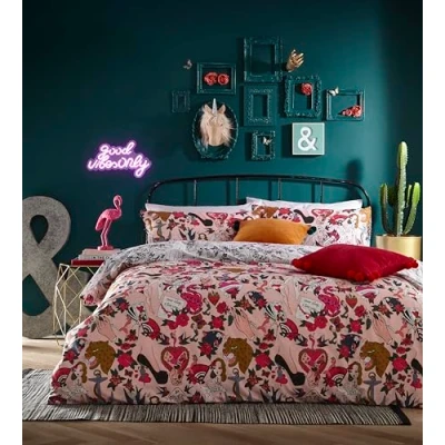 QUIRKY TATTOO-INSPIRED PRINT: Featuring a fun, cartoon-style design with bright red hearts, red roses, lusting princesses and love letters — perfect for adding a playful touch to your bedroom. REVERSIBLE DESIGN: Choose between a bold full-colour front and a comic-style black and white reverse for two unique looks in one set. SOFT & HARD-WEARING: Made from crisp polycotton for a comfortable feel that’s also durable enough for everyday use. EASY BUTTON FASTENING: Includes a clear button closure to make changing your duvet quick and hassle-free. LOW MAINTENANCE CARE: Machine washable at 30°C, with a cool iron and low tumble dry — do not bleach or use fabric softener.
