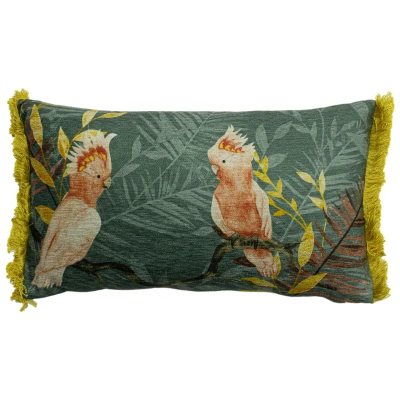 Amongst the tropical leaves, a duo of regal pink cockatoos sit gracefully together. Warm shades of pink, teal and mustard make this cushion a perfect addition to the modern home, for all-year-round exotic style. Finished with soft ruffle fringing and tonal velvet reverse.