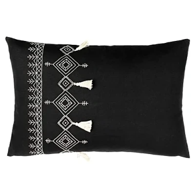furn. Pritta Cotton Embroidered Tasselled Cushion Cover Black One Size