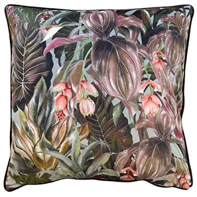 Featuring tropical botanic florals in vivid colours, set against a dramatic, vibrant background and printed on soft, luxurious velvet. Complete with a soft plain velvet reverse, contrast piped trim and zip fastening. Made of 100% Polyester, making this cushion super soft, yet durable. Designed, printed and made in the UK. Machine Washable (40 degrees max), Line Dry and Cool Iron Only.
