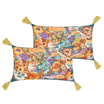Features abstractly printed bright, fiery orange and purple florals, set on a vivid blue background. Complete with plain Cotton reverses, contrasting yarn corner tasselled trims and hidden zip fastenings. Made with super soft, 100% Cotton fabric. Spot Clean Only and Do Not Iron.
