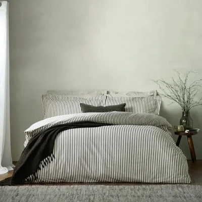 LUXURIOUSLY SOFT COTTON: Made from 100% washed cotton for a naturally soft, breathable feel that keeps you cool and comfortable through the night. REVERSIBLE STRIPED STYLE: Subtle mélange stripes with a reversible design give you two stylish looks in one, perfect for a quick bedroom refresh. ELEGANT DETAILS: Includes Oxford pillowcases with a tailored border, adding a refined yet relaxed touch to your bedding. BUTTON FASTENING: Secure clear button closure makes changing your duvet quick and easy — ideal for effortless everyday use. EASY TO CARE FOR: Machine washable at 40°C, with low tumble dry and cool iron suitable — designed for convenience and lasting freshness.