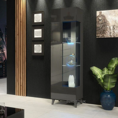 General description The Furneo Grey Display Cabinet is a modern storage solution featuring a high gloss graphite grey door and a body finished in matt graphite grey. It is accented with brushed gold handles and grey feet, providing a stylish look for any room. The cabinet includes a glass fronted milled door that can be assembled to open either to the left or right, enhancing its versatility. Technical specifications Dimensions: 50 x 182 x 40 cm (WxHxD) Includes blue LED lights (2 LED clips + UK power adapter) Mains powered with a UK power adapter and foot switch Installation This item is supplied flat packed in two parcels. Assembly is required; picture instructions and a written notice are included. Carefully review the instructions before attempting assembly.