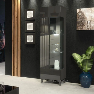 General description The Furneo Grey Display Cabinet is a modern storage solution that combines style and functionality. It features a high gloss graphite grey door and body in a sleek matt graphite grey finish, complemented by brushed gold handles and grey feet. The cabinet includes a glass fronted milled door that can be assembled to open either to the left or right, providing versatility in placement. Technical specifications Dimensions: 50 cm (W) x 182 cm (H) x 40 cm (D) Includes white LED lights (2 LED clips + UK power adapter) Mains powered with a UK power adapter and foot switch Installation The cabinet is supplied flat packed in two parcels and requires assembly. Picture instructions and a written notice are included, which should be reviewed carefully before attempting assembly. Usage The display area features two glass shelves and a wooden shelf above and below for additional storage. Please note that due to the nature of glass shelves, they will have a green hue.