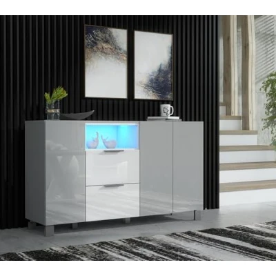 General description Add a modern touch to your living space with this stylish sideboard. The item features a gloss white and grey finish on the front doors and drawers, with a matt white and grey body (top, sides, and inside). This creates a contemporary look that complements any home decor. The sideboard includes two cupboards with shelving space and two drawers for extra storage. Technical specifications Dimensions: 135 x 80 x 40 cm (WxHxD) Blue LED lights included, mains powered with a UK power adapter and foot switch for operation. Installation This is a flatpack item and will require assembly. Picture instructions and a written notice are included with the item; these should be reviewed carefully before attempting assembly.