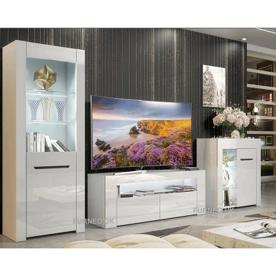 General description This Furneo High Gloss & Matt White Living Room Set includes a TV stand, sideboard, and display cabinet, all featuring a high gloss white finish on the front with a matt white finish on the rest of the body. The set is designed to enhance your living space with modern aesthetics and functionality. Technical specifications TV Stand Dimensions (WxHxD): 125x48x40cm Sideboard Dimensions (WxHxD): 75x83x35cm Display Cabinet Dimensions (WxHxD): 60x165x35cm Suitable for TVs up to 55 inches White LED lights included, mains powered with UK power adapter Installation This set is a flatpack item requiring assembly. Picture instructions and a written notice are included, and should be reviewed carefully before assembly. Usage The TV stand features two drop-down doors for storage, an upper open space for media units, and a cable management hole in the backboard. The sideboard includes an open display area with two glass shelves and a cupboard with an additional wooden shelf. The