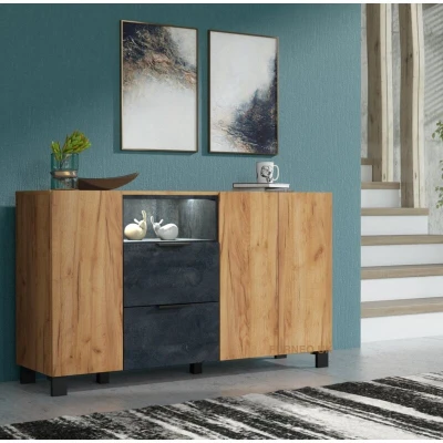 General description Add a modern touch to your living space with this stylish sideboard. The oak and black concrete effect finish creates a contemporary yet warm look that complements any home decor. The item features two cupboards with shelving space and two drawers for extra storage. Technical specifications Dimensions: (WxHxD): 135x80x40 cm White LED lights included Mains powered with a UK power adapter Foot switch to turn lights on and off Installation This is a flatpack item and will require assembly. Picture instructions and a written notice are included with the item, which should be reviewed carefully before attempting assembly.