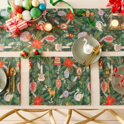 Featuring a digitally printed and hand-painted design of traditional Christmas trinkets. Set includes 4 placemats and 1 table runner. Placemat Size: 36cm x 46cm Table runner size: 35 x 180 cm. Made of 100% polyester fabric, making this dinnerware set durable and sturdy. Machine washable (30 degrees max), line dry and do not iron only.