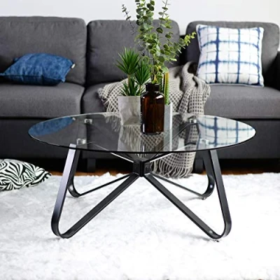 ompact Design for Space Efficiency: This round end table is designed to fit snugly in the corner of your living room or bedroom, providing a stylish and functional surface for your essentials without taking up too much space. Sturdy Tempered Glass Top: The table features a clear tempered glass top that is both aesthetically pleasing and durable. It's designed to withstand daily use while maintaining its clarity and shine. Elegant Black Metal Base: Crafted with a black metal frame, the end table offers a modern look that complements a variety of interior styles. The metal base ensures stability and supports the glass top securely. Adjustable Feet for Leveling: The end table is equipped with adjustable feet, allowing you to level the table on uneven floors with ease, ensuring a steady and safe surface for your items. Versatile Use as a Side Table: Perfect for placing next to a sofa, bed, or armchair, this end table serves as a convenient spot for drinks, books, or decorative items, enhancing the functionality of your living space.