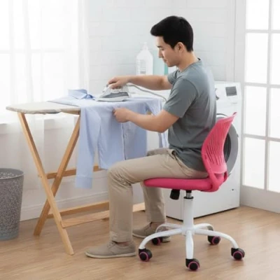 FurnitureR Ironing Chair,Ergonomic Backrest,Comfortable and Flexible Five Rollers,Free Movement During Ironing,Simple Stylish Design,Suitable for Rooms,PINK