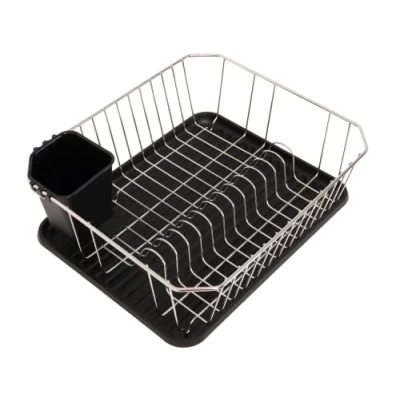 Dish drainer with a slotted rack & a flat surface Made from stainless steel with a silver-effect finish Plastic Tray and Cutlery Drainer Main parts: Steel with a silver-effect finish and Plastic H13 cm x W32 cm x D36 cm