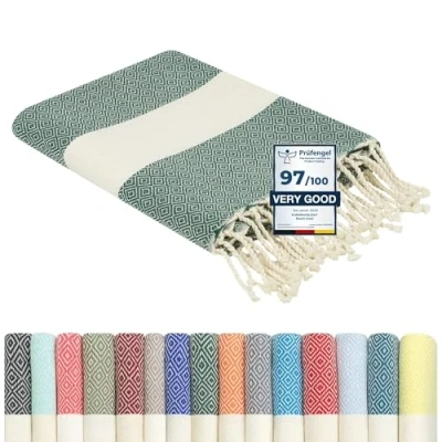 Amazon Our lightweight Beach Towels made of cotton are the original Fouta Turkish Towels from Tunisia. Ideal as a versatile companion for any adventure... Extra Large Beach Towels for adults (39 x 79 Inch / 100 x 200 cm) - When spread out, our cotton beach towel is big enough to have a picnic for two or to lie on alone. You can also wrap it around your hips or wear it as a pareo sarong. Lightweight + space saver: When folded, this XXL beach towel is very compact thanks to the thin woven, high-quality cotton fabric - so it fits in any beach bag on the go! Adventurous & Versatile: Cotton beach towel | Sun lounger towels | Sand free beach blanket | Picnic blanket | Compact travel towel & blanket | Swimming towel | Sauna, spa, hammam towel | Sofa throw, bedspread | Camping blanket | 2-in-1 yoga blanket & towel | Beach accessories, holiday essentials for women and men | Gift and much more... The original from Tunisia: In cooperation with small manufacturers in Tunisia, our turkish beach towel foutas are woven according to traditional craftsmanship. the cords are twisted and knotted by hand. Every purchase supports the existence of these families.
