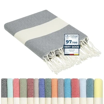 Amazon Our lightweight Beach Towels made of cotton are the original Fouta Turkish Towels from Tunisia. Ideal as a versatile companion for any adventure... Extra Large Beach Towels for adults (39 x 79 Inch / 100 x 200 cm) - When spread out, our cotton beach towel is big enough to have a picnic for two or to lie on alone. You can also wrap it around your hips or wear it as a pareo sarong. Lightweight + space saver: When folded, this XXL beach towel is very compact thanks to the thin woven, high-quality cotton fabric - so it fits in any beach bag on the go! Adventurous & Versatile: Cotton beach towel | Sun lounger towels | Sand free beach blanket | Picnic blanket | Compact travel towel & blanket | Swimming towel | Sauna, spa, hammam towel | Sofa throw, bedspread | Camping blanket | 2-in-1 yoga blanket & towel | Beach accessories, holiday essentials for women and men | Gift and much more... The original from Tunisia: In cooperation with small manufacturers in Tunisia, our turkish beach towel foutas are woven according to traditional craftsmanship. the cords are twisted and knotted by hand. Every purchase supports the existence of these families.