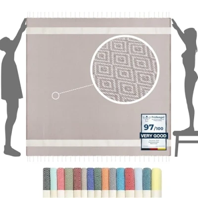 Amazon Our extra large beach towels for adults are the original fouta turkish towels from Tunisia. Also stunning as a picnic blanket and beach blanket throw on balmy summer evenings... Giant XXL beach towel made of cotton (79 x 79 Inch / 100 x 200 cm): When spread out, the beach towel is large enough for two people to lie on and have a picnic. Lightweight + space saver: When folded, this XXL beach towel is very compact thanks to the thin woven, high-quality cotton fabric - so it fits in any beach bag on the go! Adventurous & Versatile: XXL beach towel 200 x 200 cm | Large beach sheet, sand free beach blanket | Picnic blanket | Sun lounger towels | Swimming towel | Hammam & sauna towel | Bedspread, sofa throw | Bath towel | Compact travel towel blanket | Camping blanket | 2-in-1 yoga blanket & towel | Beach accessories, holiday essentials for women and men | Gift and much more... The original from Tunisia: In cooperation with small manufacturers in Tunisia, our turkish beach towel foutas are woven according to traditional craftsmanship. the cords are twisted and knotted by hand. Every purchase supports the existence of these families.