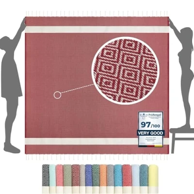 Our extra large beach towels for adults are the original fouta turkish towels from Tunisia. Also stunning as a picnic blanket and beach blanket throw on balmy summer evenings... Giant XXL beach towel made of cotton (79 x 79 Inch / 100 x 200 cm): When spread out, the beach towel is large enough for two people to lie on and have a picnic. Lightweight + space saver: When folded, this XXL beach towel is very compact thanks to the thin woven, high-quality cotton fabric - so it fits in any beach bag on the go! Adventurous & Versatile: XXL beach towel 200 x 200 cm | Large beach sheet, sand free beach blanket | Picnic blanket | Sun lounger towels | Swimming towel | Hammam & sauna towel | Bedspread, sofa throw | Bath towel | Compact travel towel blanket | Camping blanket | 2-in-1 yoga blanket & towel | Beach accessories, holiday essentials for women and men | Gift and much more... The original from Tunisia: In cooperation with small manufacturers in Tunisia, our turkish beach towel foutas are woven according to traditional craftsmanship. the cords are twisted and knotted by hand. Every purchase supports the existence of these families.