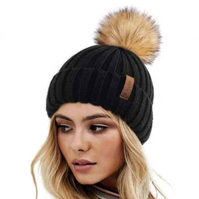 FURTALK Winter Hats for Women Double Layer Fleece Line Beanie Hat with Bobble Pom Black