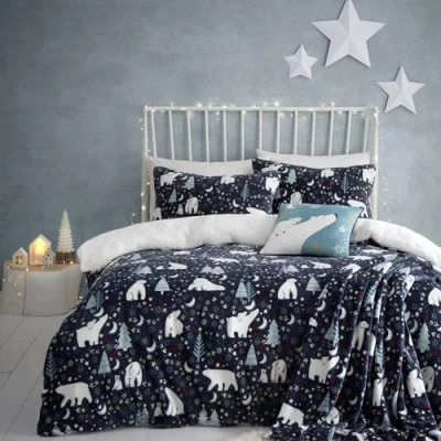 A cute family of polar bears stroll happily across this stunning night-time scene bedding from Fusion. Printed on to an incredibly soft and cosy fleece fabric this duvet cover set will look sensational on any bed. So comfy, you’ll never want to get out of of bed. Festive Christmas-themed fun bedding from Fusion to get you in the mood for the Xmas holiday season Fits a standard UK Kingsize duvet quilt size: 230cm Width x 220cm Length (97x87") - Pillowcase size 76cm x 48cm Fabric: 100% Polyester | Care: 40° machine wash. Tumble dry on low. Wash and iron inside out Pack Contents: 1 x UK King Size Duvet Cover and matching 2 x Pillowcases. Complete the look by buying the matching Starry Night Blue Popper Closure