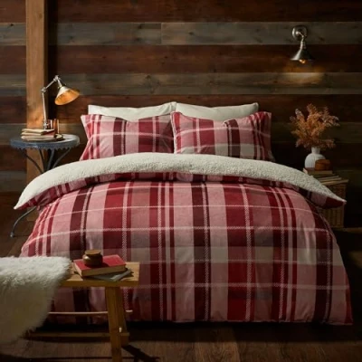 Fusion Strata Red Check Fleece Duvet Cover Double Size (200 x 200cm) Reversible Tartan Design Burgundy Flannelette Bedding Teddy Bear & White Quilt