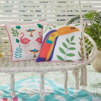 Step into the exotic oasis with Tropical Flamingo! Our outdoor cushion flaunts fabulous flamingos and fascinating feathered friends that will transport you to a tropical paradise. Embrace the vibrant colours and whimsical designs while lounging comfortably. And the best part? This tropical treat won't break the bank. Get ready to flamingle in style with Tropical Flamingo! Fusion is a fashionable, fun-loving choice for all who adore contemporary good looks and great quality. From simple stripes and classic colours to funky checks and irresistible patterns, all at an affordable price. 43 x 43cm square cushion with filling pad( Zip opening to allow removal of filling pad) Fabric: 100% Cotton & 100% Polyester filling pad Pack Contents: 1 x Cushion (with 100% polyester filling pad) .