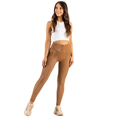 FUTURO Fashion Women Leggings High Waisted with Panel Tummy Control Snake Print Stretchy Pants Slimming Leather Effect Opaque Casual Wear FS792 Brown XL/2XL