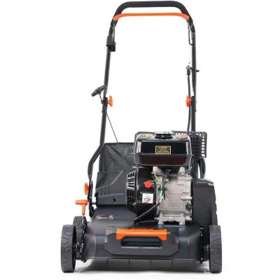 The FUXTEC 2in1 petrol scarifier FX-BV240ECO 2in1 function: scarifying and catching The new FX-BV240ECO model is a reliable and powerful scarifier that actively helps you to prepare your lawn for the upcoming green season and to maintain it professionally! It is great for removing dead grass from the lawn! This will make your grass significantly greener, healthier and stronger! Moss formation on the surface is reduced or prevented. All this is extremely perfect and gentle on your garden! Thanks to its powerful working width of 400 mm and the various 6 working depths (-15 to +5 mm) and the associated step adjustment of the scarifier, it can be adapted to the most diverse requirements of your lawn and thus serves as an optimum solution thanks to the central working depth adjustment. It has a height adjustment lever. The petrol tank has a capacity of 3.6 liters and thus supplies the engine with fuel for a sufficiently long time due to its size. The oil tank volume is 0.6 liters . The