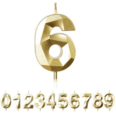 【CANDLES INFORMATION】: Comes with 1 piece numeral candles with number 6. The numeral birthday candle size is approx. 5 cm/ 1.97 inches in length, total length (include the candle pick) is approx. 11.5 cm/ 4.5 inches, proper size as cake topper decoration for most birthday and wedding cake. 【SAFE MATERIAL】: Our birthday candles are made of environmentally friendly materials, safe and odorless, suitable for birthday cakes of any size or for any celebration like birthday party, anniversary, theme party and etc, ideal sparkler candles for birthday cakes, happy birthday candle, birthday candles number 【PACKAGING AND CRAFTSMANSHIP】: Our birthday candles have a strong three-dimensional shape, just like the cut surface of diamonds, suitable for people of any age and both genders. The birthday cake candles is packed by kraft carton, which is more protective than the blister card package on the market and can effectively prevent the candle from being crushed, can meet your birthday party needs. 【MULTI-USAGE 】: This candle is in golden colors, bright and shining in the dark. And it matches with party decorations of various themes and colors easily. It is not only for children's birthdays but for adult birthdays. Ideal cake decoration for many occasions, such as birthdays, baby showers, anniversaries, retirement parties, family reunions, weddings, Hawaiian parties, even Christmas, must-have items for party cake, bring you memorable and meaningful party 【Delicate appearance, 3D visual sense】 : Happy birthday cake candles are meaningful for you to celebrate your birthday and nice cake topper decoration for embellishing your cake and cupcake, bright glow for creating romantic atmosphere and adding a touch of elegant