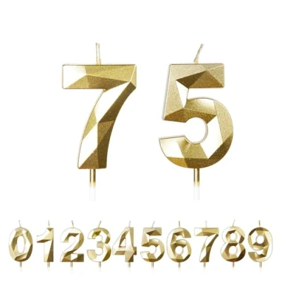 【CANDLES INFORMATION】: Comes with 2 pieces numeral candles with number 7 and 5. The numeral birthday candle size is approx. 5 cm/ 1.97 inches in length, total length (include the candle pick) is approx. 11.5 cm/ 4.5 inches, proper size as cake topper decoration for most birthday and wedding cake. 【SAFE MATERIAL】: Our birthday candles are made of environmentally friendly materials, safe and odorless, suitable for birthday cakes of any size or for any celebration like birthday party, anniversary, theme party and etc, ideal sparkler candles for birthday cakes, happy birthday candle, birthday candles number 【PACKAGING AND CRAFTSMANSHIP】: Our birthday candles have a strong three-dimensional shape, just like the cut surface of diamonds, suitable for people of any age and both genders. The birthday cake candles is packed by kraft carton, which is more protective than the blister card package on the market and can effectively prevent the candle from being crushed, can meet your birthday party needs. 【MULTI-USAGE 】: This candle is in golden colors, bright and shining in the dark. And it matches with party decorations of various themes and colors easily. It is not only for children's birthdays but for adult birthdays. Ideal cake decoration for many occasions, such as birthdays, baby showers, anniversaries, retirement parties, family reunions, weddings, Hawaiian parties, even Christmas, must-have items for party cake, bring you memorable and meaningful party 【Delicate appearance, 3D visual sense】 : Happy birthday cake candles are meaningful for you to celebrate your birthday and nice cake topper decoration for embellishing your cake and cupcake, bright glow for creating romantic atmosphere and adding a touch of elegant