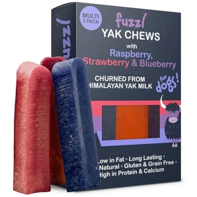 Fuzzl Raspberry, Strawberry, Blueberry Yak Chews for Dogs Box 3 225g Natural Himalayan Cheese Treats Long Lasting, Grain Free, Antioxidant & Vitamin Rich Dental