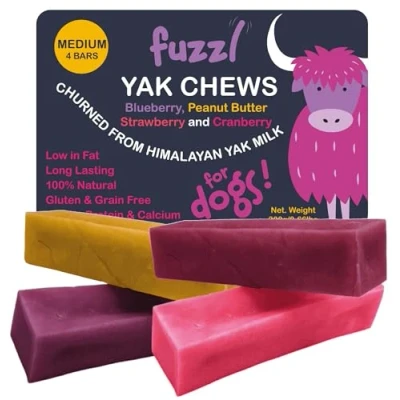 100% Natural Dog Chew with Blueberry, Strawberry, Peanut Butter, Cranberry - All Natural Fuzzl Yak Chews are made with 100% natural and premium ingredients. At Fuzzl only the best natural ingredients are used. This Dog Yak Chew is churned from Himalayan Yak Milk, providing your four legged friend with a tasty natural treat Long Lasting Yummy Dog Treat - This long lasting dog chew will provide your dog with a delicious source of Calcium and Protein. The size and texture will ensure your dog is kept busy for hours and providing important nutrients Healthy, Nutritious and Low in Fat - High in Protein and Calcium, our Yak Chews make an excellent snack for dogs. Unlike Rawhide, these dog teeth cleaning chews are great for your pets digestive system Natural Dental Chew - Dogs will love Fuzzl Yak Chews and they have the added benefit of being excellent Dental Teeth Cleaning Chews. This dog food is a tasty dog treats for small, medium and large dog and an excellent alternative to dog bones Gluten and Grain Free Healthy Dog Treats - These Calming Dog Treats are the perfect no hide dog chews and the ideal dog treats for large dogs, medium and small dogs. Enjoy Fuzzl Dog Treats Natural