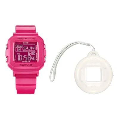 Mix, match, make it your own! A brand-new BABY-G + PLUS series to celebrate the 30th anniversary of BABY-G in 2024. This Digital watch has a calendar function: Day-Date as well as Stop Watch , Timer , Worldtime , Alarm and Light. Comes in a set with a White Case holder holder High quality 19 cm length and 20 mm width Pink Plastic strap with a Buckle Case measurement: 38 X 38 mm,case thickness: 12 mm, case colour: Pink and dial colour: Black Water resistant: 10 bars-Weight: 32 g The watch is delivered in an original gift box and has a warranty of 2 years