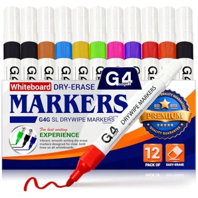 G4GADGET 12 Pack Whiteboard Pens, Dry Wipe Markers Bullet Tip, Assorted Colourful White Board Erasable, Low Odour Marker Pens for School Supplies, Office, Home & Classroom