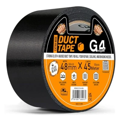 ✅ HEAVY DUTY INDUSTRY STANDARD: G4GADGET black duct tape is made for demanding jobs. Thick reinforced backing with ultra-strong adhesive delivers a solid hold that stays firm under pressure. ✅ WEATHER RESISTANT & OUTDOOR READY: Built to perform in changing conditions like moisture, cold, heat and everyday outdoor exposure. Great for garage fixes, camping repairs and long-lasting sealing. ✅ MULTI-PURPOSE FOR EVERY TASK: Use as duct tape or heavy duty gaffer tape for packaging, moving boxes, HVAC work, carpet edges, DIY crafts, home repairs and workshop use. ✅ TEARS BY HAND – EASY TO APPLY: No cutters needed. Tears cleanly in both directions, wraps smoothly around corners and uneven surfaces for a neat, professional finish. ✅ STRONG GRIP ON MOST SURFACES: Bonds quickly to plastic, metal, wood, glass, tiles, fabric and more. Ideal for sealing, bundling, reinforcing, strapping and emergency repairs.