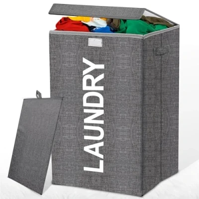 G4GADGET Luxury Laundry Basket with Lid, 60L Heavy Duty Foldable Washing Hamper, Large Collapsible Clothes Storage Bin for Bedroom, Bathroom, Dorm & Living Room (Grey/Beige Random)