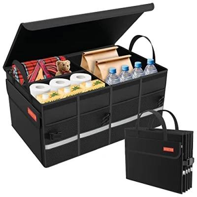 PREMIUM QUALITY CAR BOOT TIDY – The car boot organiser is made from high-quality polyester to provide a tough material that lasts longer and comes in stealth black to match the car interior. EXPANDABLE – No need for separate car boot bags, it can be expanded to create room for larger items and each divider can be removed making this the ultimate boot storage organiser. It has inside and outside pockets providing optimum, quick access storage efficiency. Organise each section of the car organiser bag for cleaning products, tools, camping accessories and kids & baby toys and essential items. NON-SLIP – No need for a car boot mat because the bottom is non-slip straight out of the box. It won’t move around inside your vehicle and cause damage to other items or slide into the passenger when placed on the rear car seats. WATERPROOF – The waterproof material means it can withstand the conditions in your car. Have peace of mind when carrying drinks or your car cleaning products in this premium waterproof car storage box. Even if anything spills it won't dirty your clean boot or van storage area. EASY TO CLEAN – The best boot organisers are long lasting and easy to keep clean. Just give the waterproof material a wipe with a damp cloth to clean and then keep using it endlessly for car stowing & tidying.